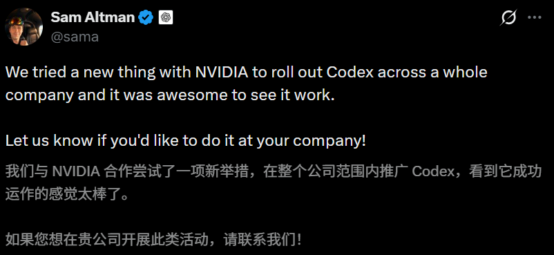 奥特曼在X上转发了这封信,「在英伟达全公司部署Codex,效果很好。想在你的公司试试吗?」