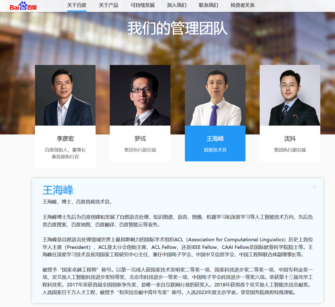 王海峰在百度官网的介绍