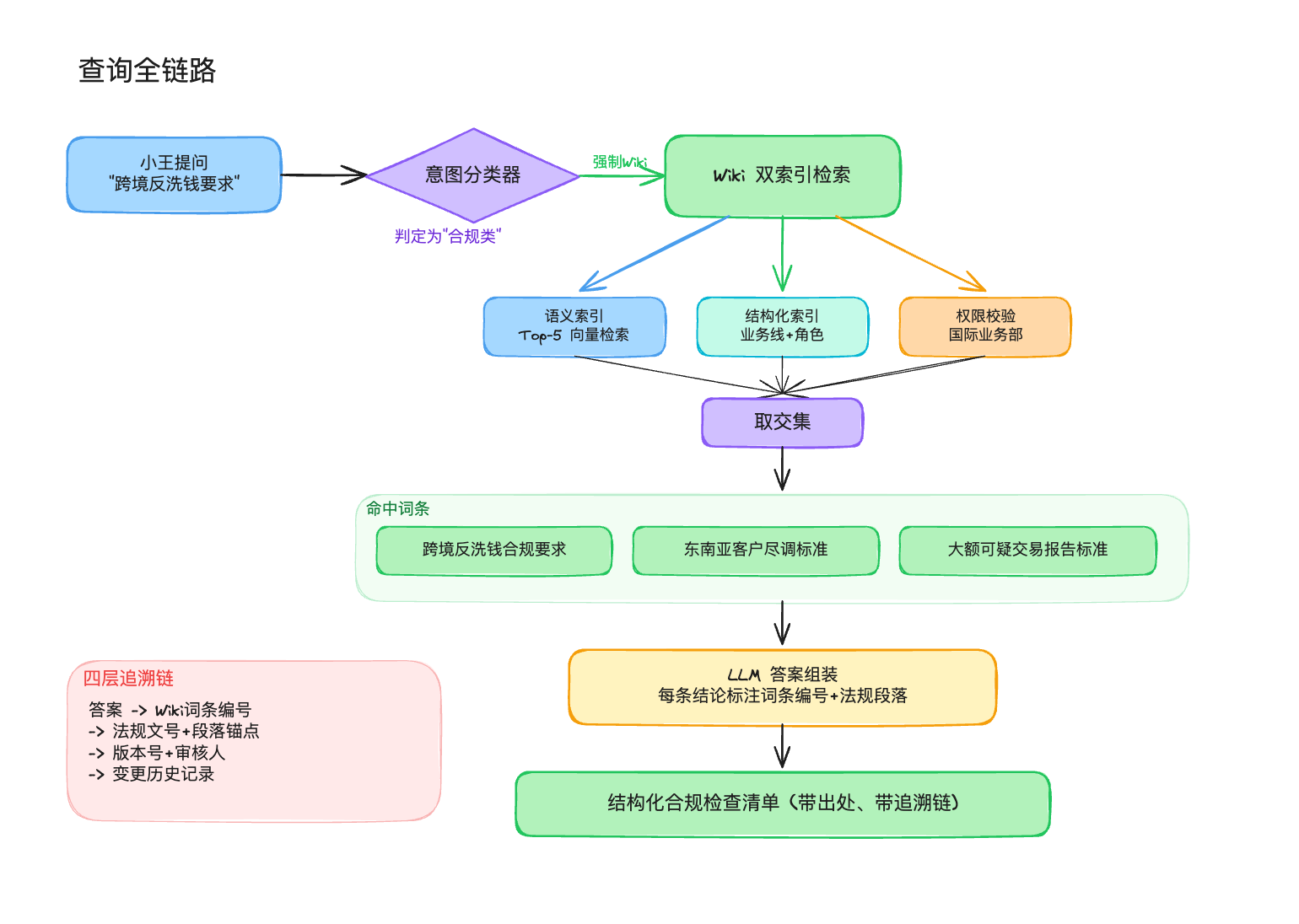 小王在内部合规助手里输入这个问题。系统第一步做意图分类,判定为”合规类查询”,直接走Wiki通道。