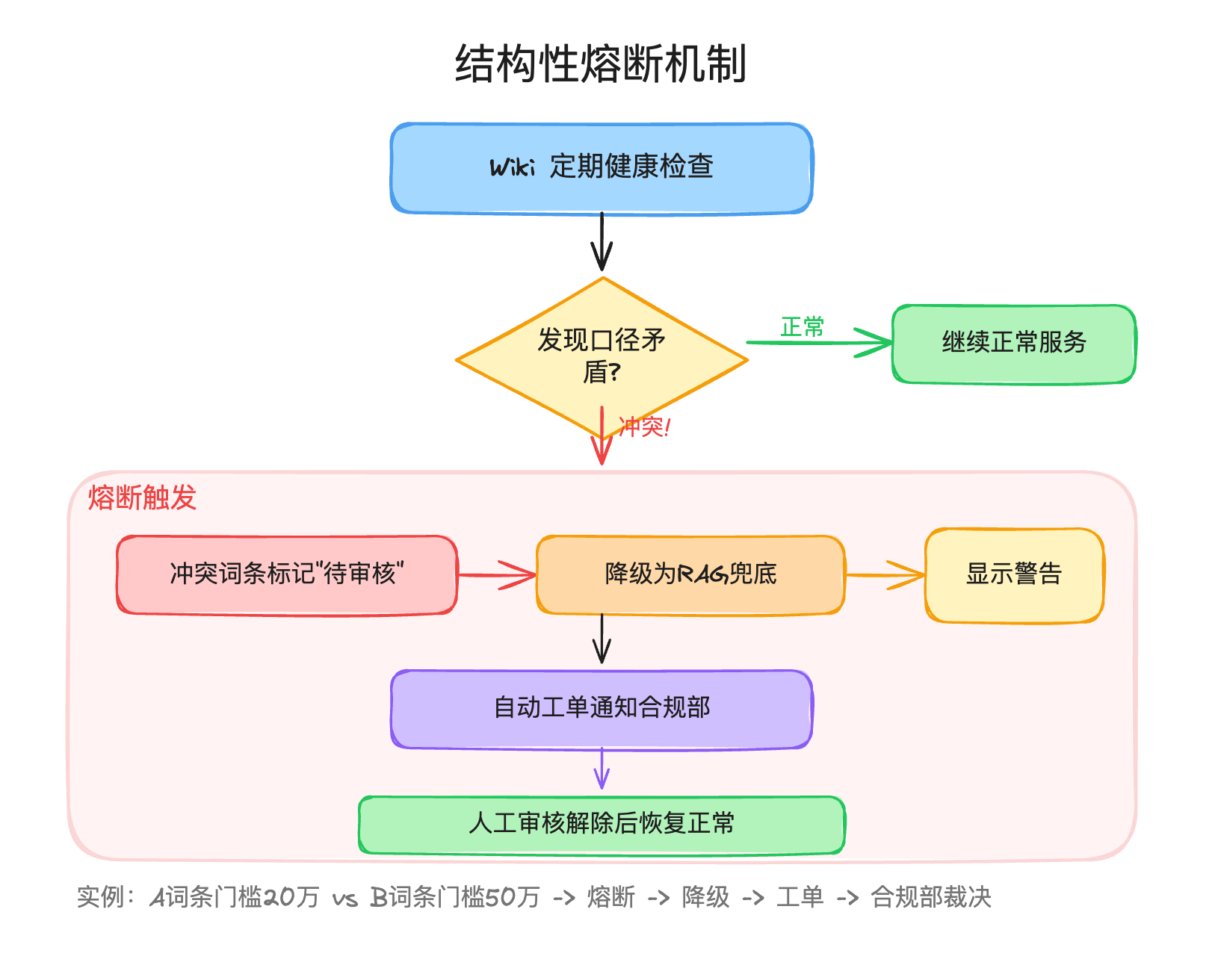 我设计了一个叫”结构性熔断”的机制来兜底。Wiki定期做健康检查,一旦发现矛盾词条,自动触发熔断:冲突词条标记为”待审核”状态,查询时降级为RAG兜底,回答页面显示警告”当前知识库存在口径冲突,以下回答仅供参考”,同时自动生成工单通知合规部处理。