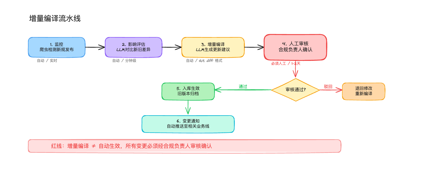 我在方案里反复强调了一条红线:增量编译不等于自动生效。所有变更必须经合规负责人审核确认后才可入库。金融行业的合规口径不是靠算法定的,算法只能帮你把待审核的东西准备好,最后拍板的必须是人。