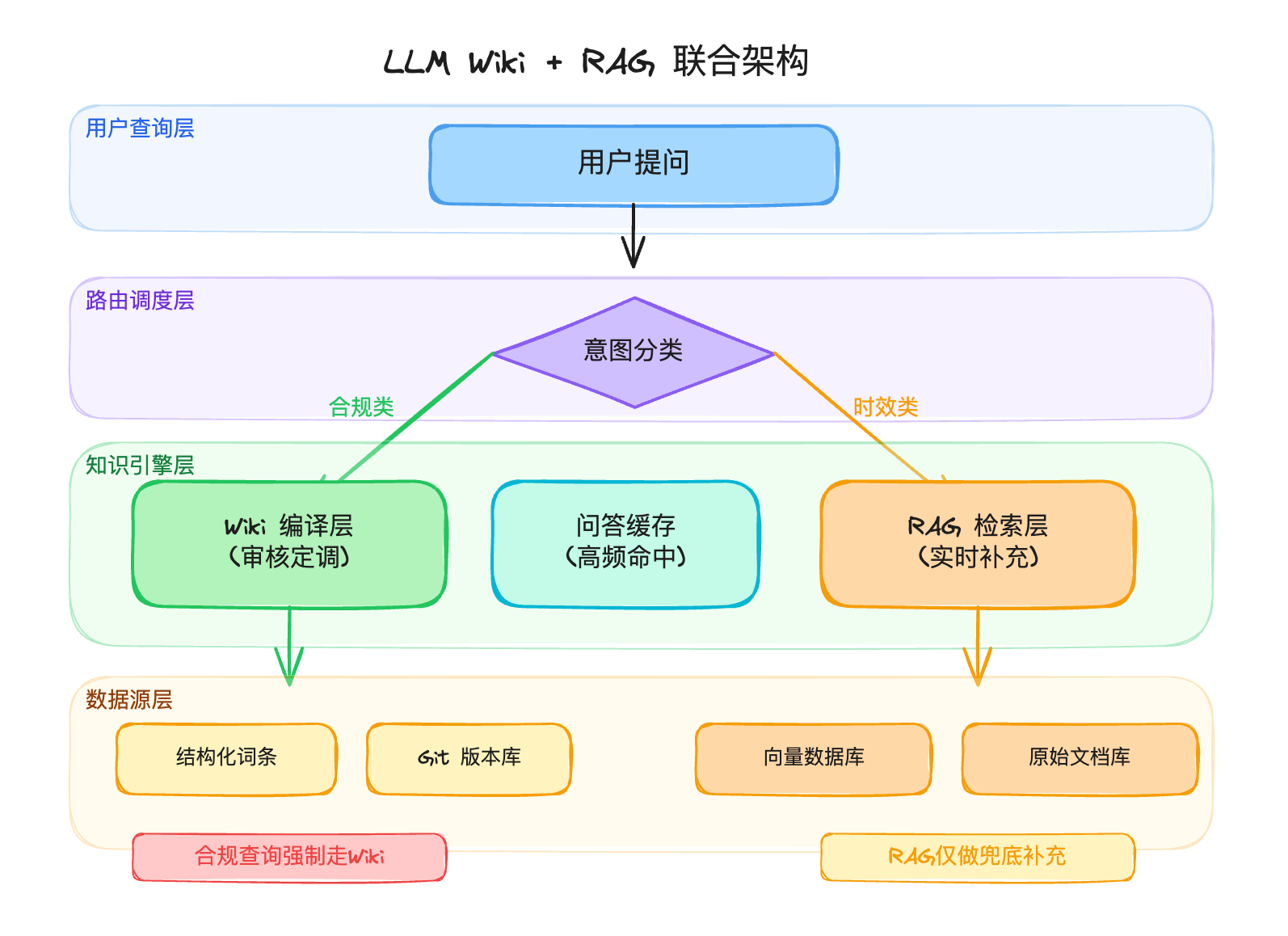 LLM Wiki加RAG不是什么颠覆性的新物种。它做的事情很朴素:把该定调的知识定调,把该实时检索的内容实时检索,中间加一个路由来分流,底下加一个熔断来兜底。