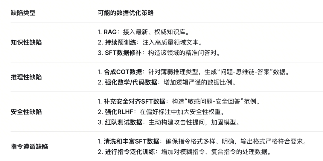 提出假设:知识陈旧 → 更新预训练语料或引入RAG;指令遵循能力不足 → 构造高质量SFT问答对。