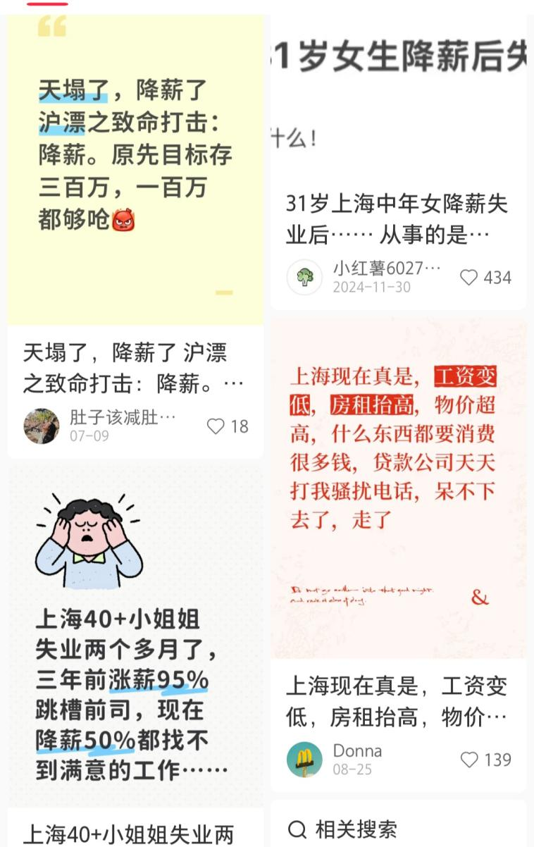 在小红书、抖音等社交平台上,城市打工人降薪或裁员的内容也受到大量关注。