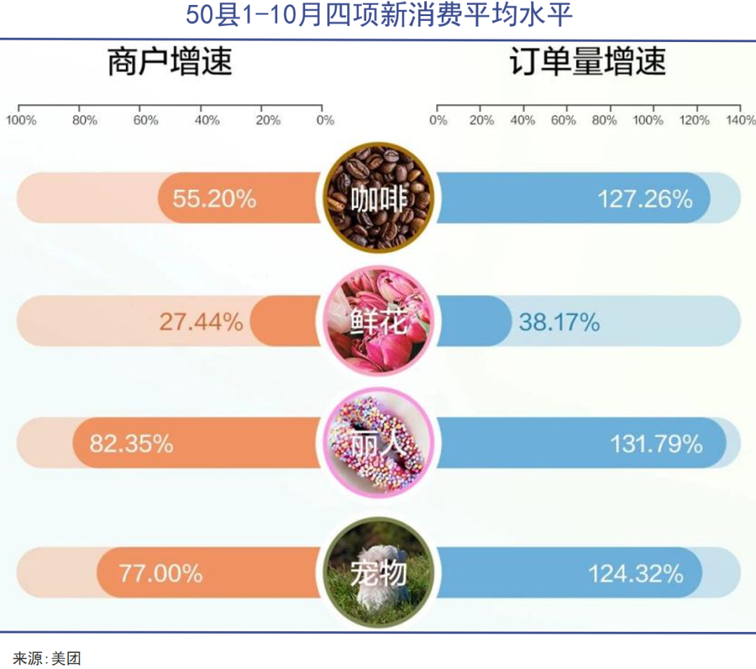除了“互联网+”模式,县域服务业也在快速崛起——民宿、咖啡馆、宠物店、艺术工作室、酒馆、互动农场等新兴业态在小县城和村庄不断涌现。美团对50个县域样本的调查显示,去年1-10月,县域多个新业态实现增长,其中咖啡、丽人、宠物类订单量增幅超1倍,相关商户增速也超过50%。