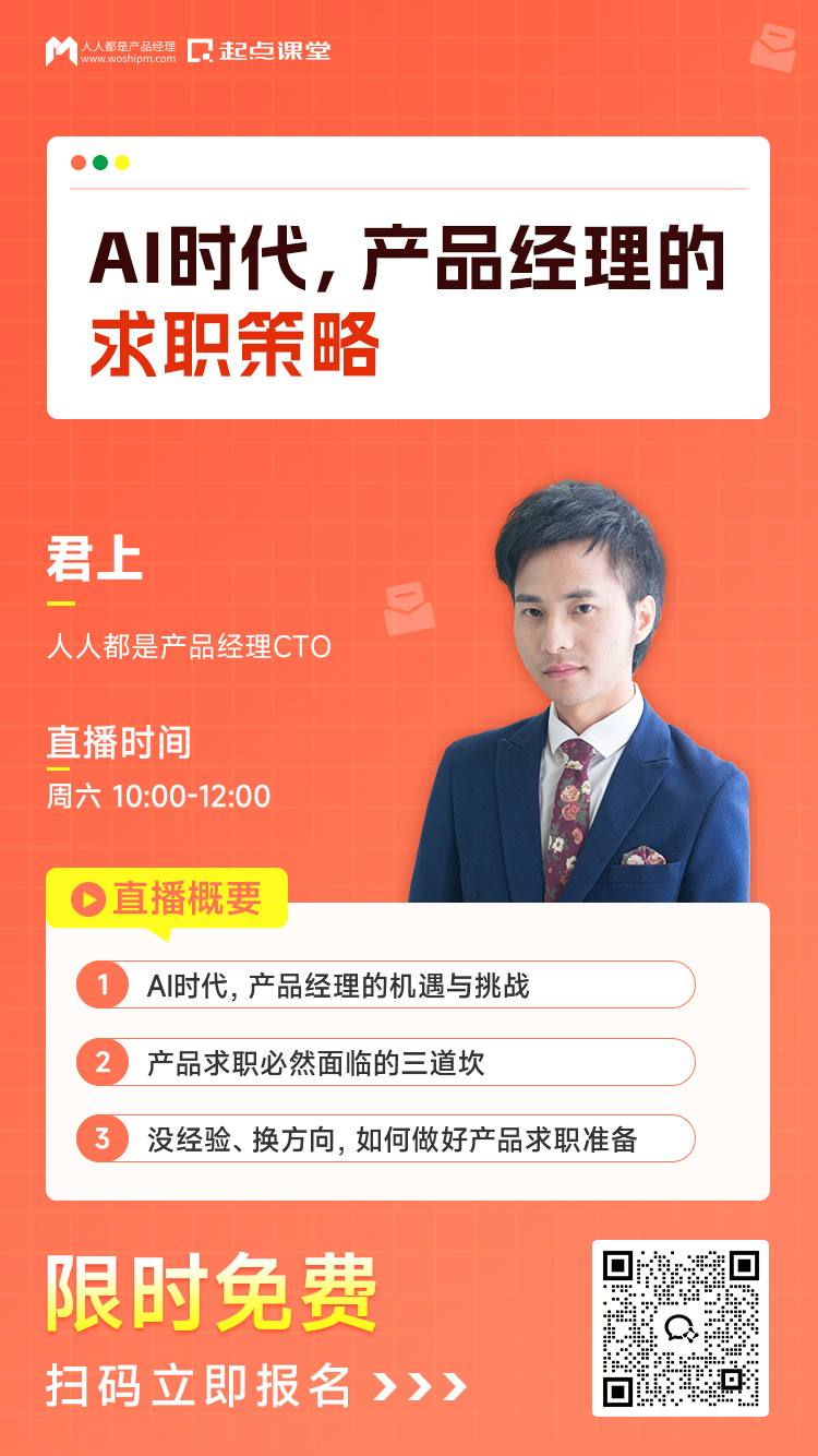 本周六10点-12点,特邀人人都是产品经理CTO@君上老师,专为“求职焦虑”打造一场产品人专属免费分享! 为你拆解“求职三道坎”: