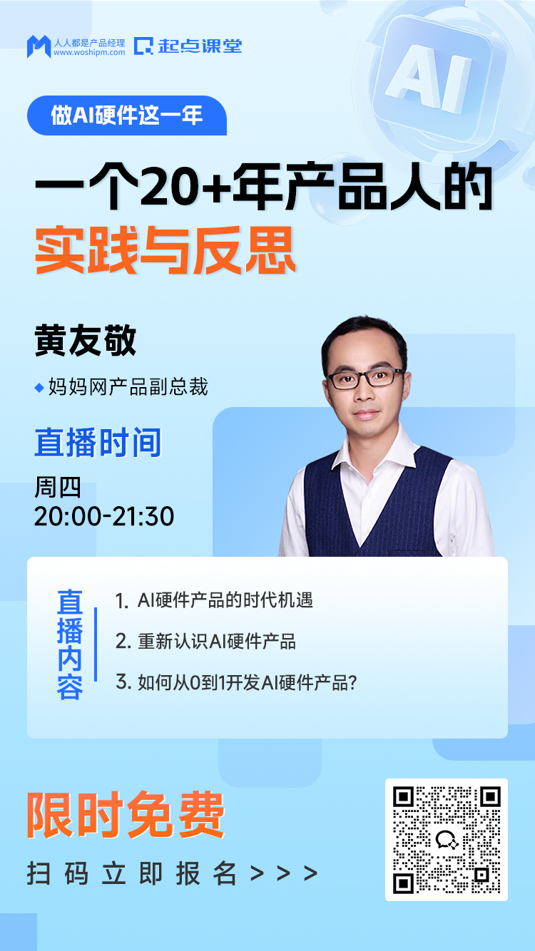为了帮助更多产品人快速掌握AI硬件产品关键信息,人人都是产品经理x起点课堂特邀妈妈网产品副总裁@黄友敬老师直播分享。带你深度剖析 AI 硬件产品的时代机遇,让你精准把握行业风向;重新认识 AI 硬件产品,刷新你的认知边界;以及如何从 0 到 1 开发 AI 硬件产品。