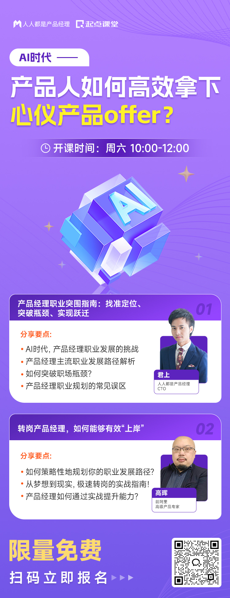 本周六10点-12点,特邀人人都是产品经理CTO@君上老师、前阿里高级产品专家@高晖老师,专为“求职焦虑”打造一场产品人专属免费分享! 带你: