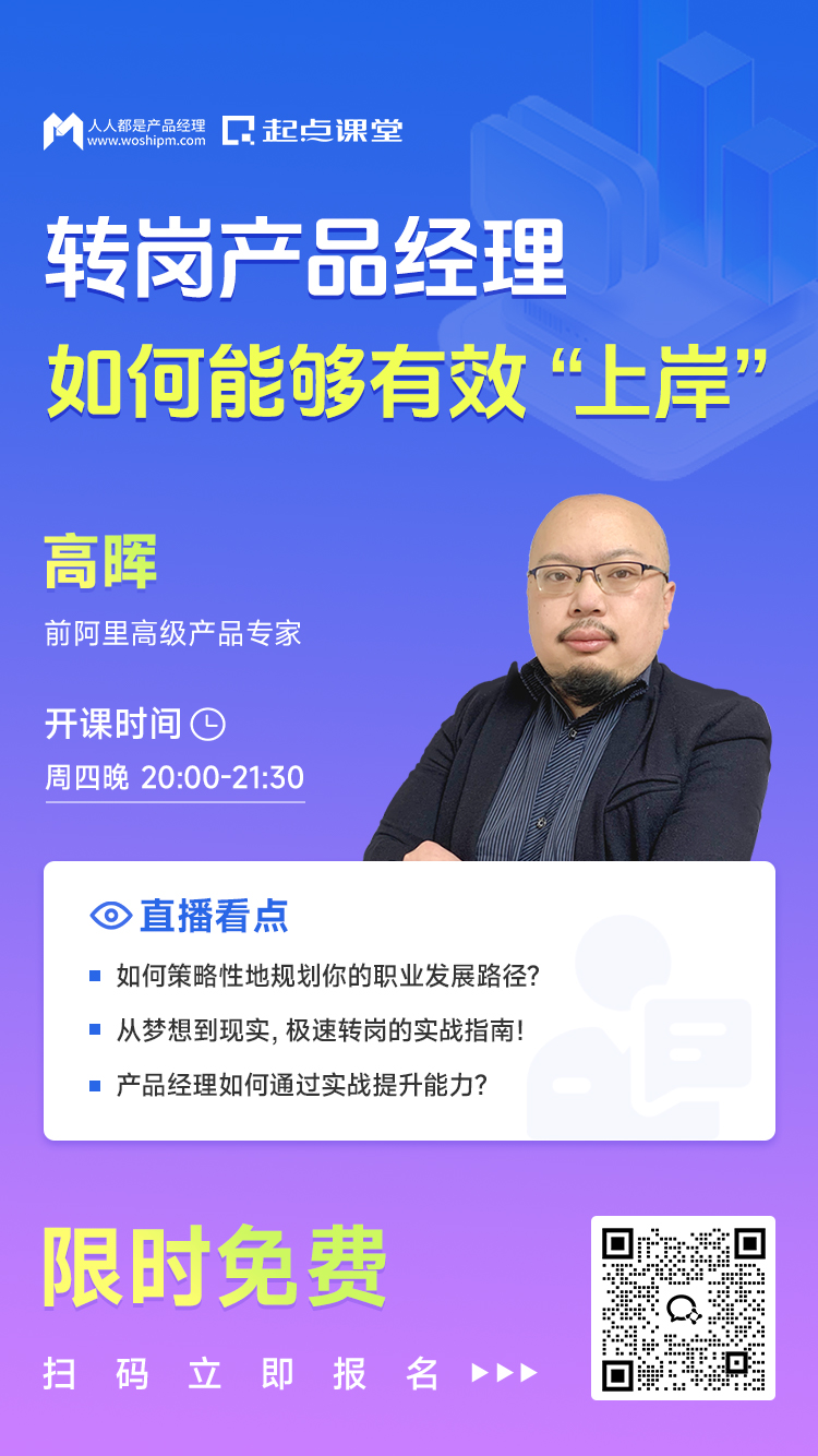 我们特邀前阿里高级产品专家、《业务中台产品搭建指南》作者@高晖老师在线直播,剖析老师从程序员到高级产品专家的亲身经历,帮你规避转岗产品大坑,教你如何提升转岗产品经理必备的基本能力!