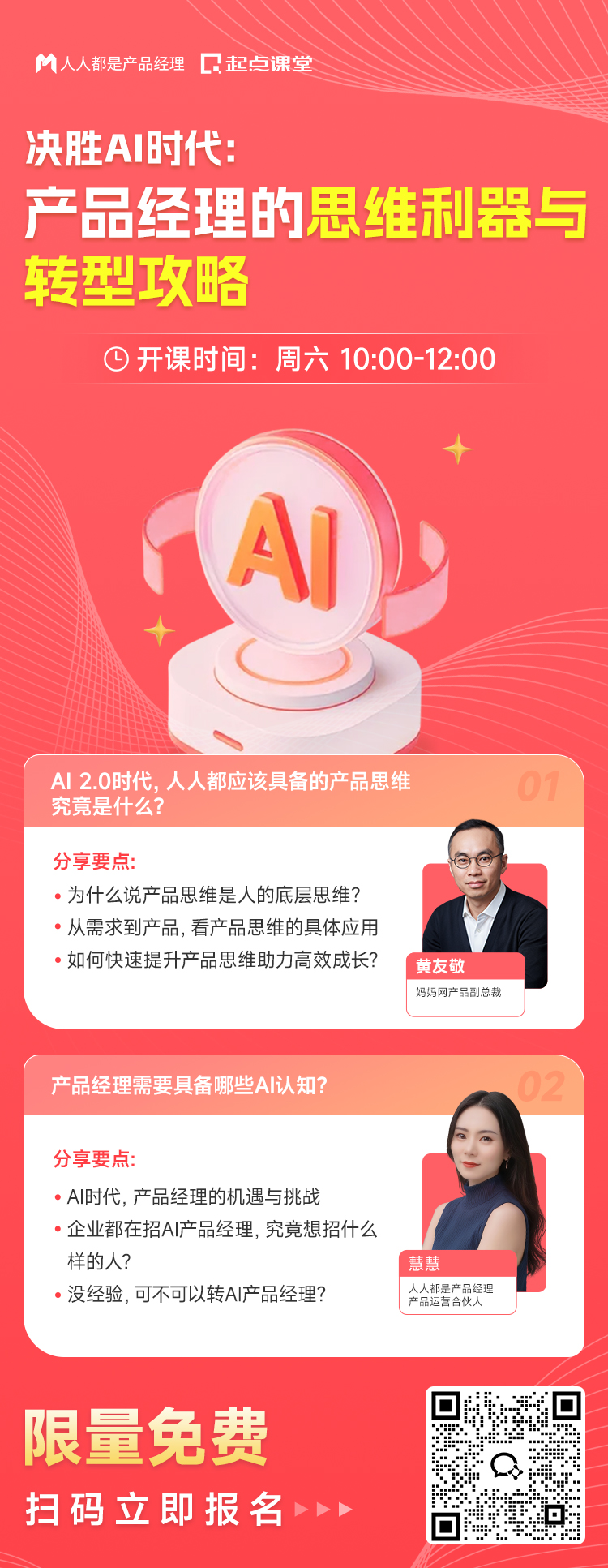 我们邀请了妈妈网产品副总裁,前阿里P8@黄友敬老师、人人都是产品经理产品运营合伙人@慧慧老师直播讲解产品思维的本质和在具体需求→产品实践中的应用思路,并分享产品经理必备的AI认知!