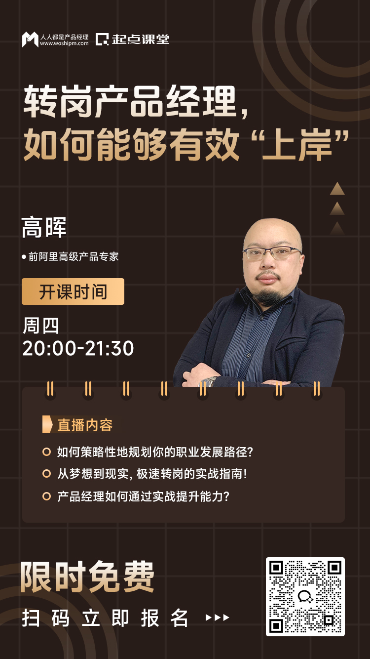 我们特邀前阿里高级产品专家、《业务中台产品搭建指南》作者@高晖老师在线直播,剖析老师从程序员到高级产品专家的亲身经历,帮你规避转岗产品大坑,教你如何提升转岗产品经理必备的基本能力!
