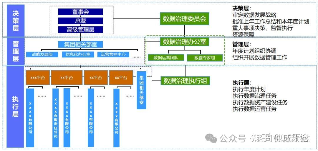 - 决策层由企业高管组成的数据治理委员会担当,负责审定数据战略和重大事项;