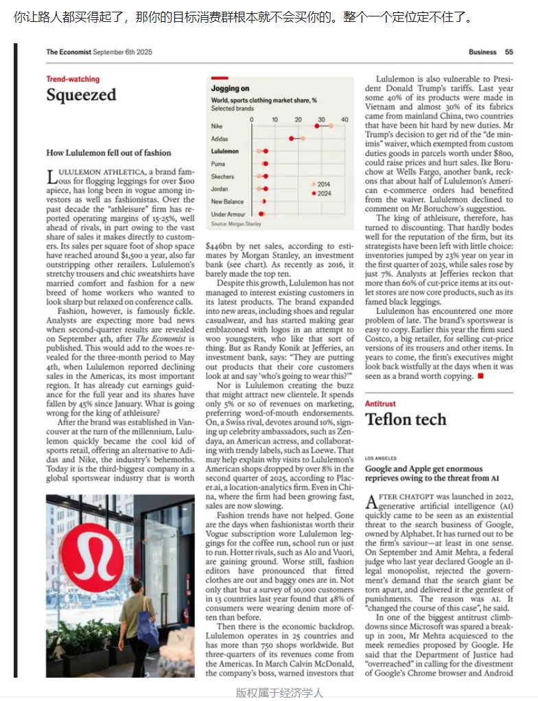 所以为什么今年Lululemon市值崩塌?前两天经济学人在那讨论来讨论去,一堆人分析什么跟不上新时代营销理念,NONONO,我觉得他的问题,反而恰恰是太注重新时代的各种数据,却丢掉了品牌创立之初的人性洞察。