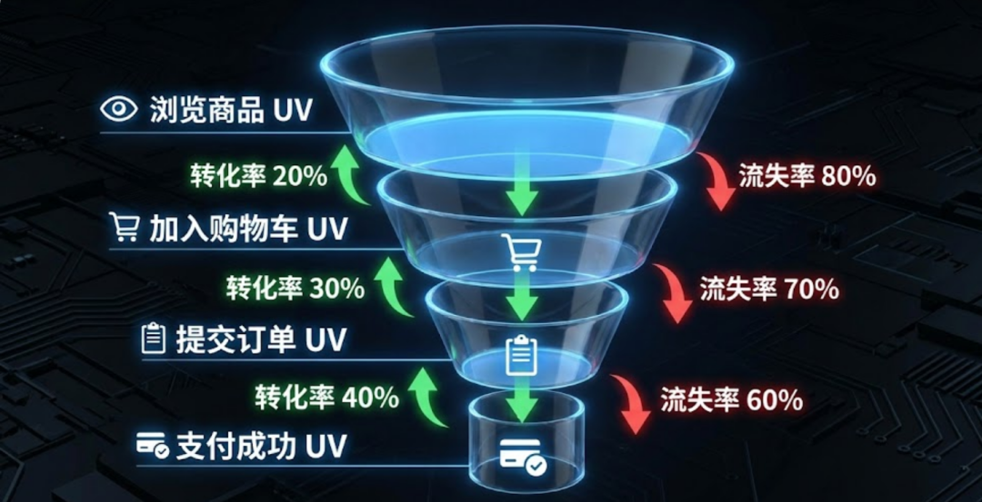 漏斗分析是追踪用户在关键业务流程中每一步转化与流失情况的核心工具。它将用户行为路径(如“浏览商品 → 加入购物车 → 提交订单 → 完成支付”)可视化为一个层层递减的漏斗。