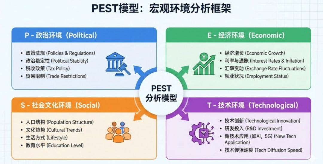 PEST 分析帮助我们在出发前看清风向,避免驶入政策的禁区或逆经济的周期。