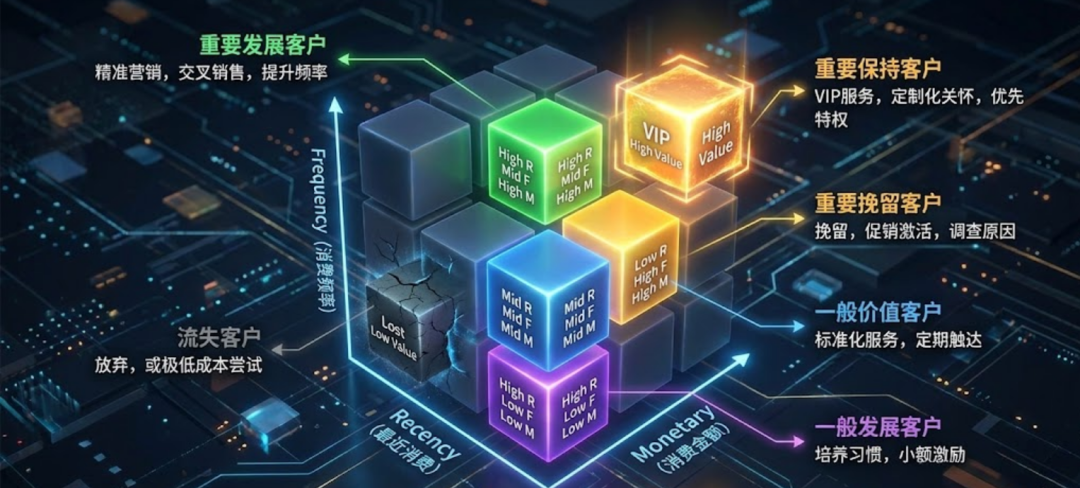 通过这三个维度,可以将用户划分为8种类型,如“重要价值用户”(R高F高M高)、“重要挽留用户”(R低F高M高)等。针对不同类型的用户,可以采取截然不同的运营策略:对重要价值用户提供VIP服务,对重要挽留用户进行主动关怀和召回,对新用户提供引导和激励。RFM模型是实现“千人千面”精细化运营、将资源用在刀刃上的基础。
