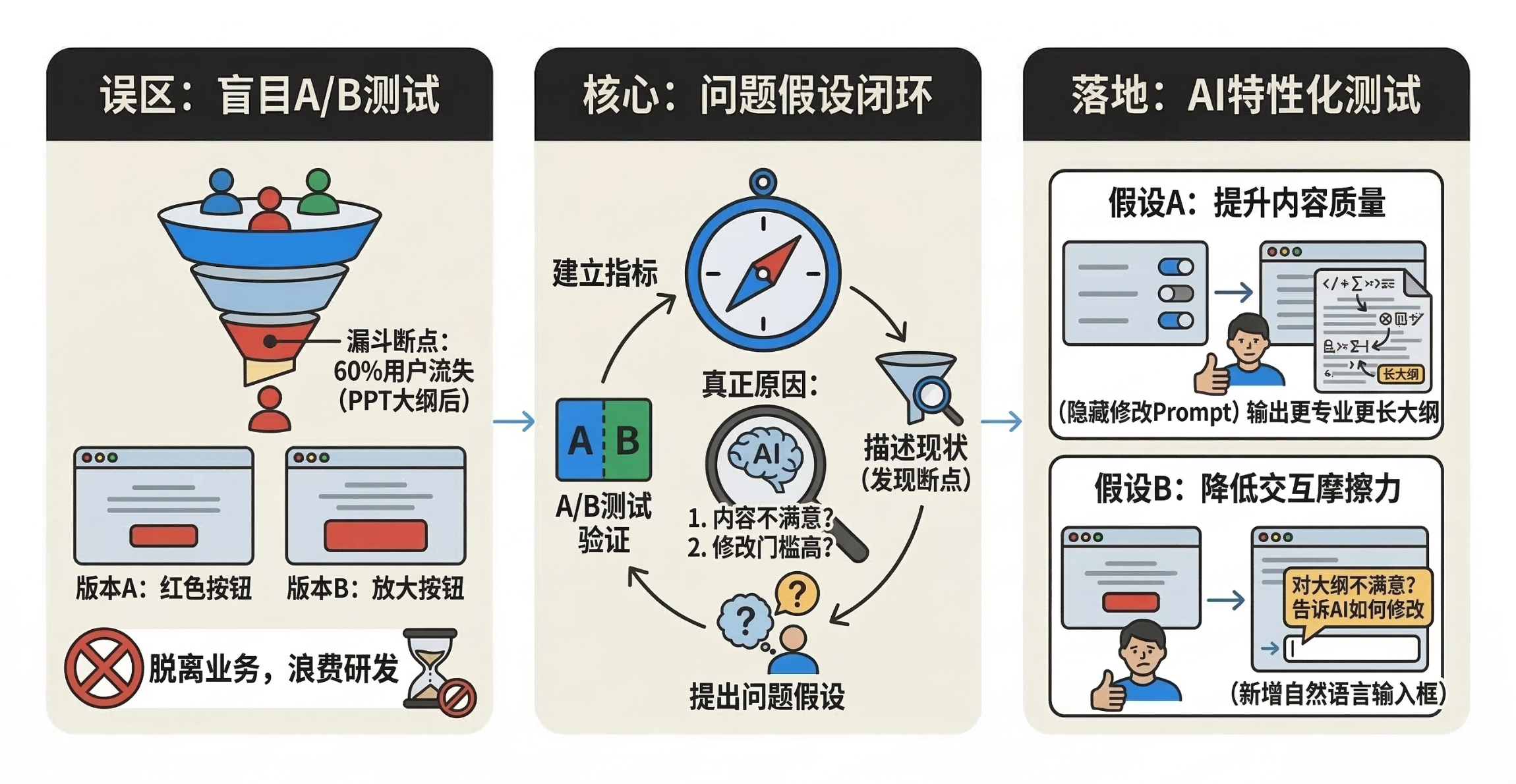 核心在于第三步:提出假设。在上述AI生成PPT流失的场景中,用户不点按钮,绝大概率不是因为看不见,而是对AI生成的内容不满意,且修改门槛太高。