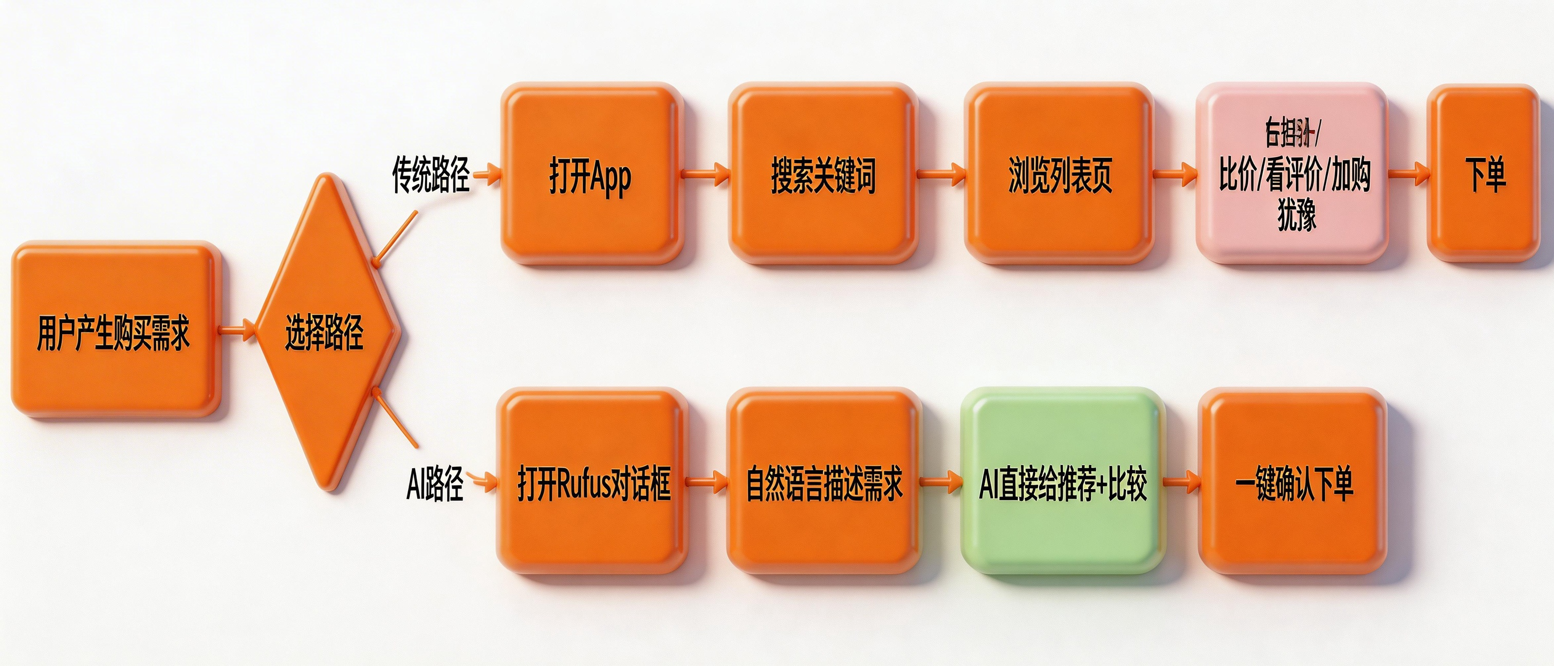核心改变:用户的”比价-看评价-加购-犹豫-下单”这整个决策过程,以前发生在商品列表页,现在发生在对话框里。