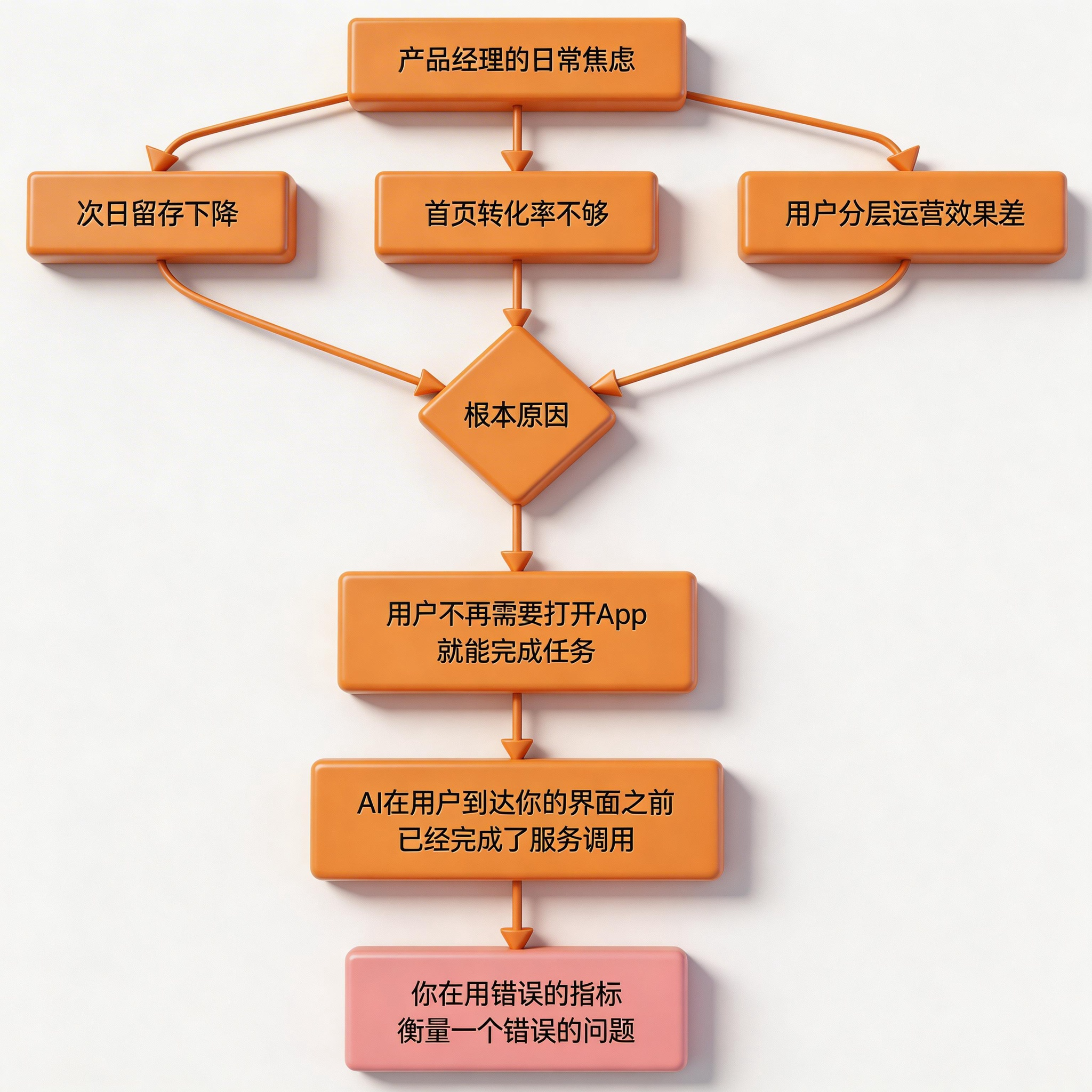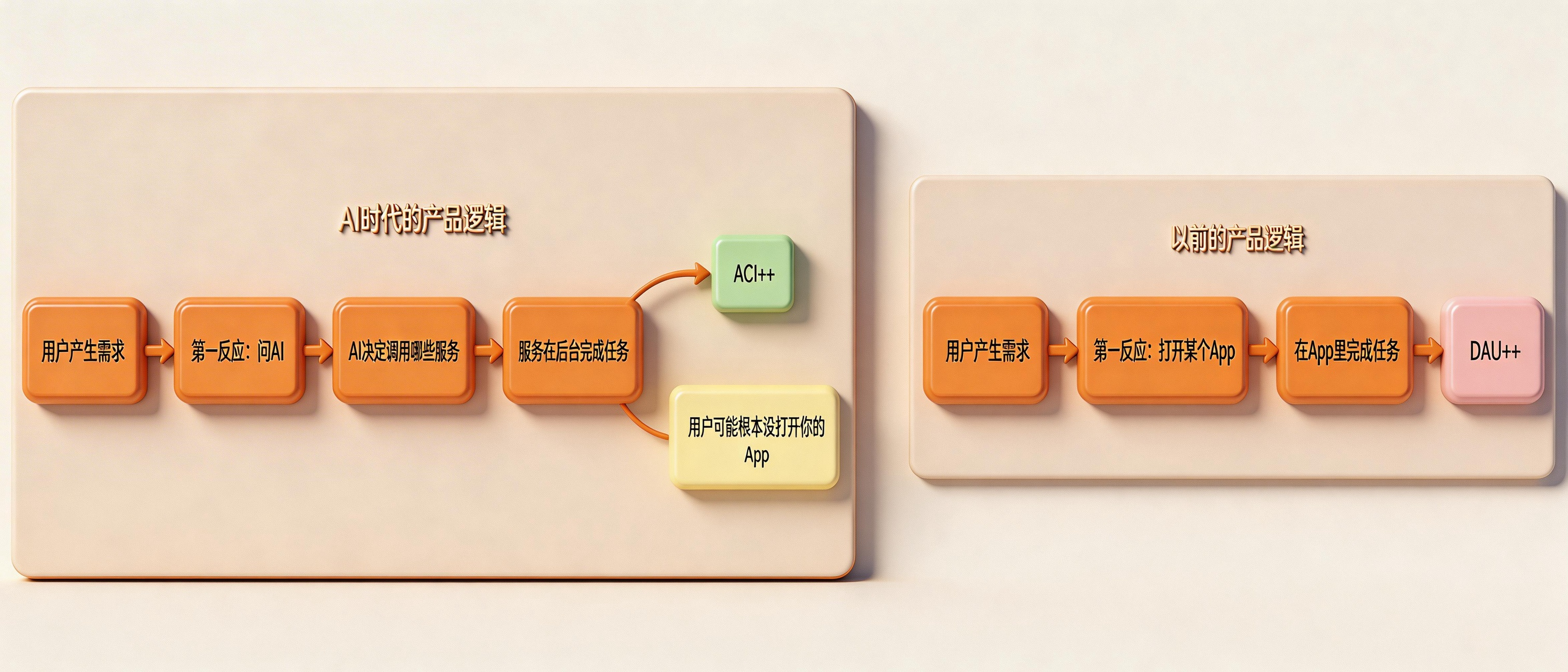 当AI可以代替用户”打开App、完成任务”,用户根本不需要出现在你的界面上——但你的服务依然被使用了。DAU没变,但你的产品已经在被边缘化。
