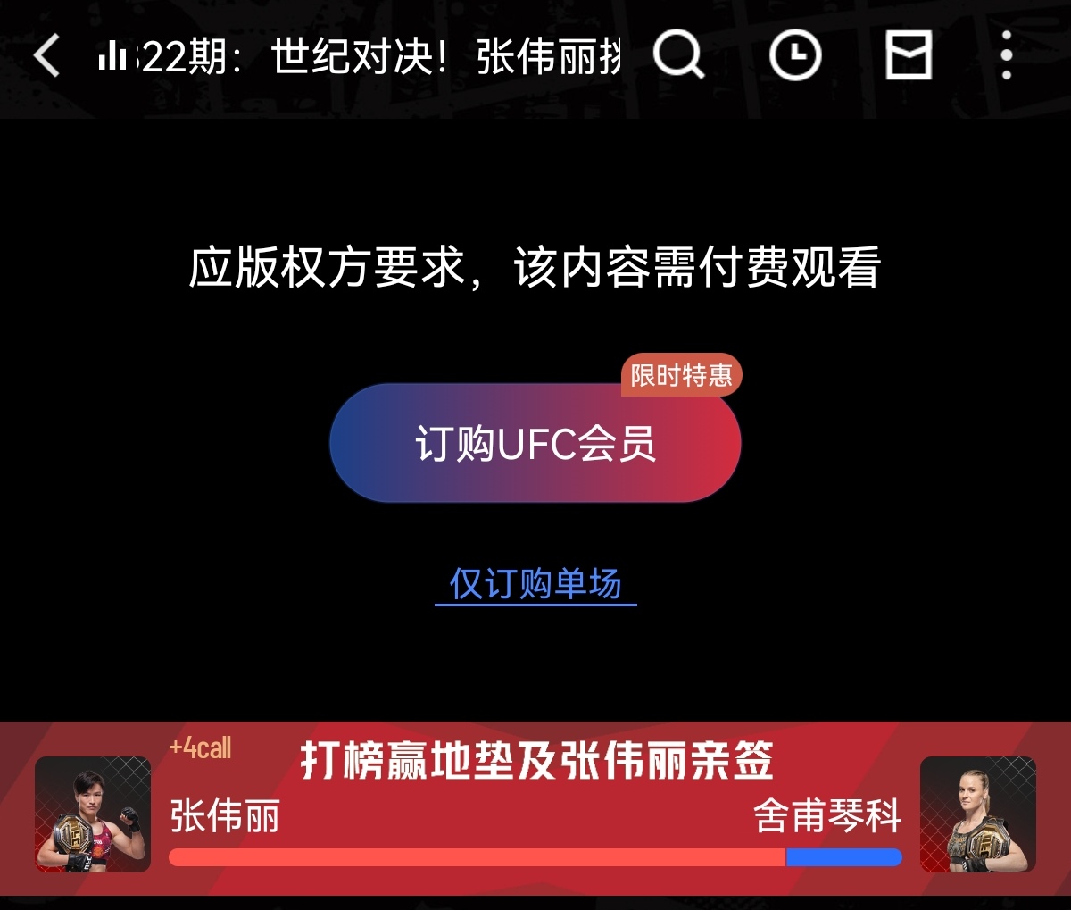 最近下载咪咕视频APP,主要是想看#舍甫琴科vs张伟丽#,很遗憾最后判定不敌舍甫琴科。进入咪咕视频,原来看UFC还要订购UFC会员,单月25元