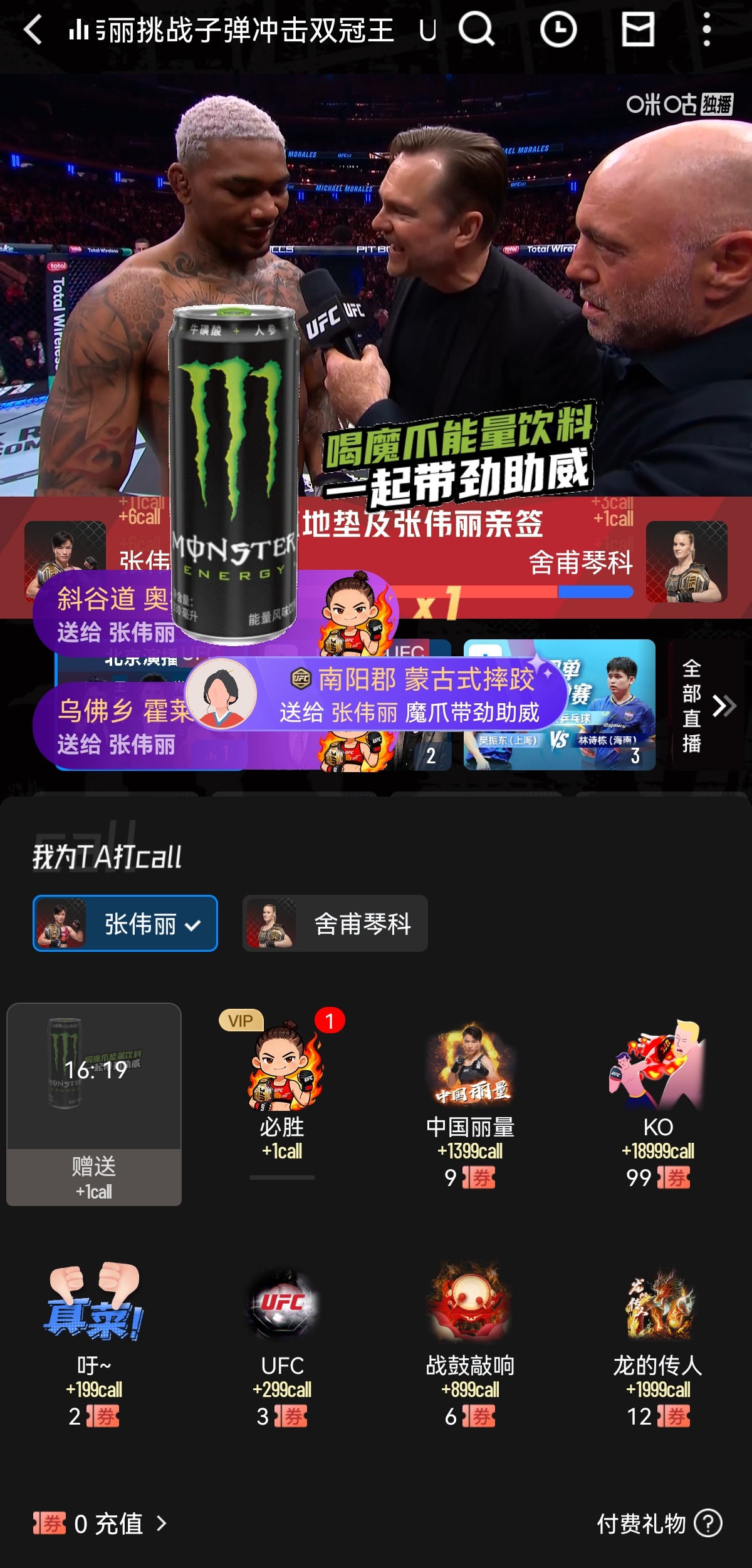 主播、运动员包括明星解说互动的过程中,也穿插着卖货主播和电商小卡片链接。可以点击口令福袋,去参与抽奖,概率很小,礼物就一件UFC出场服。回到赛场直播,期间也播着其他选手的boxing赛,也可以为其打call,有免费的魔爪能量饮料打卡(大约每16min,可赠送一次礼物),也可以买付费礼物(必胜这个礼物,估计是开通会员有的权益吧)。
