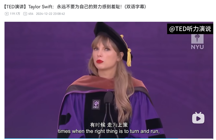【【TED演讲】Taylor Swift:永远不要为自己的努力感到羞耻!(双语字幕)】 https://www.bilibili.com/video/BV1hZCNYDEkH/?share_source=copy_web&vd_source=dd390a429182e2f5e92d0a04b56f638d