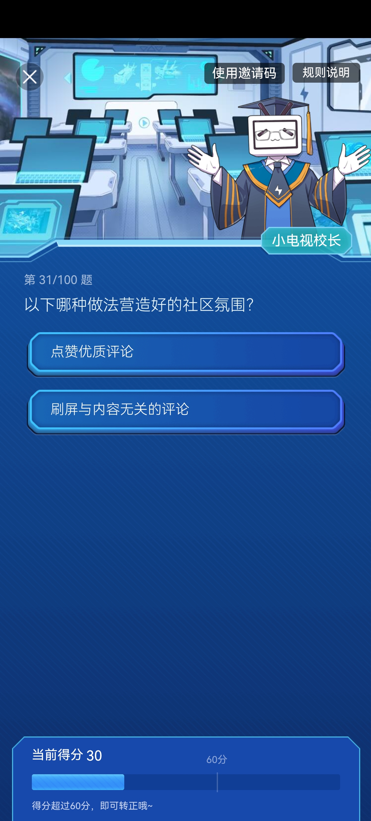 B站,我逛得比较少,前几天看到一个比较不错的视频剪辑,还想着投币,结果发现自己还没转正,还得参与B站的考试(100题/60分转正),题目类型关于用户操作行为、良好社区氛围建设。