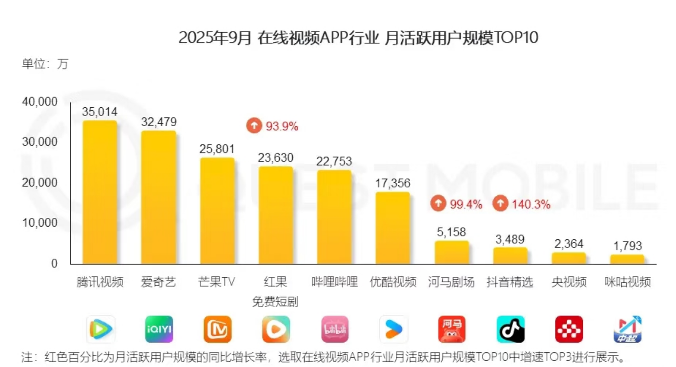 据Quest Mobile 2025年9月在线视频月活跃用户规模数据(如下),、/还是位居TOP1和TOP2;芒果和红果(不了解这平台啊,不看短剧啊)已经超越B站和