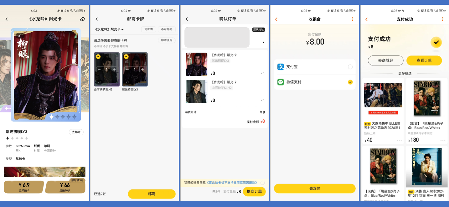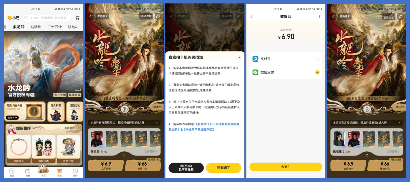 芒果通常会售卖卡片大礼包,有各种明星的卡片,电视剧角色卡片。有各种玩法,有抽奖盲盒,分单次抽和多次抽。笔者最近迷上水龙吟,去抽过粼光卡,第一次抽到的是风流店的尊主-柳眼。抽卡结束后,可以根据自己喜好,选择小卡申请邮寄,需另付邮费。
