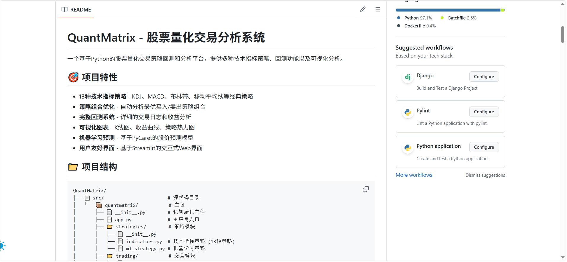 在技术实现上,QuantMatrix整合了多个专业的Python库,包括AkShare(数据获取)、TA-Lib(技术指标计算)、Pandas和NumPy(数据处理)、PyCaret(机器学习)、PyEcharts(数据可视化)和Streamlit(Web界面)等。这些库的整合使QuantMatrix能够提供专业、高效的量化分析功能,满足投资者的各种需求。