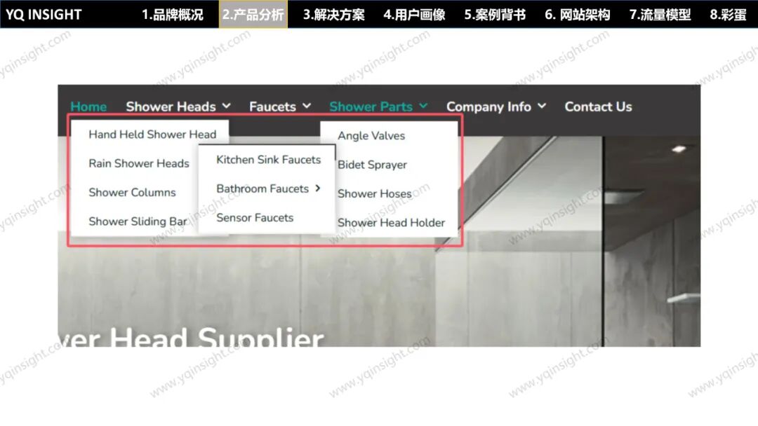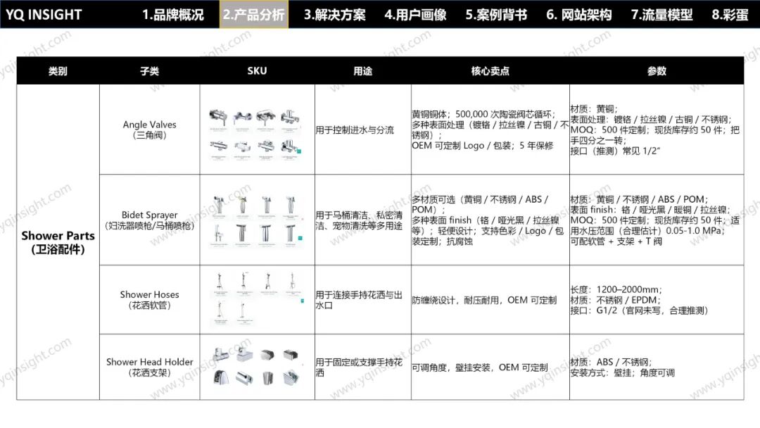 - ShowerParts(卫浴配件):涵盖三角阀、喷枪、软管、支架,起到配套补齐的作用。