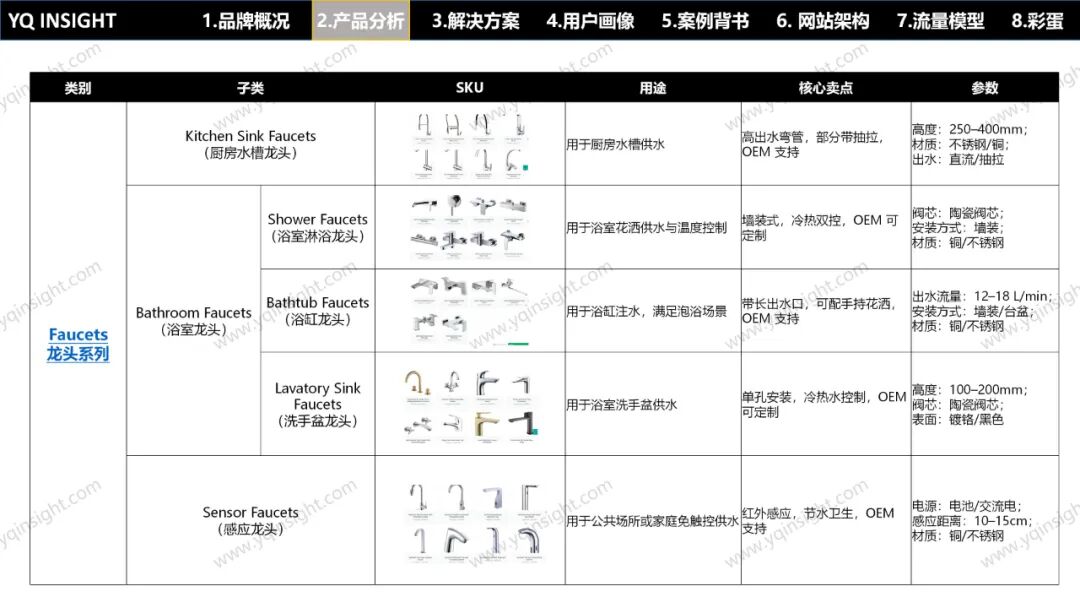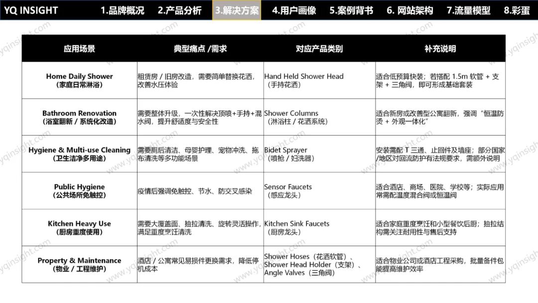 - 缺失部分:缺乏系统化的“技术卖点”或“场景化价值”,比如耐用测试、节水认证、适配方案。