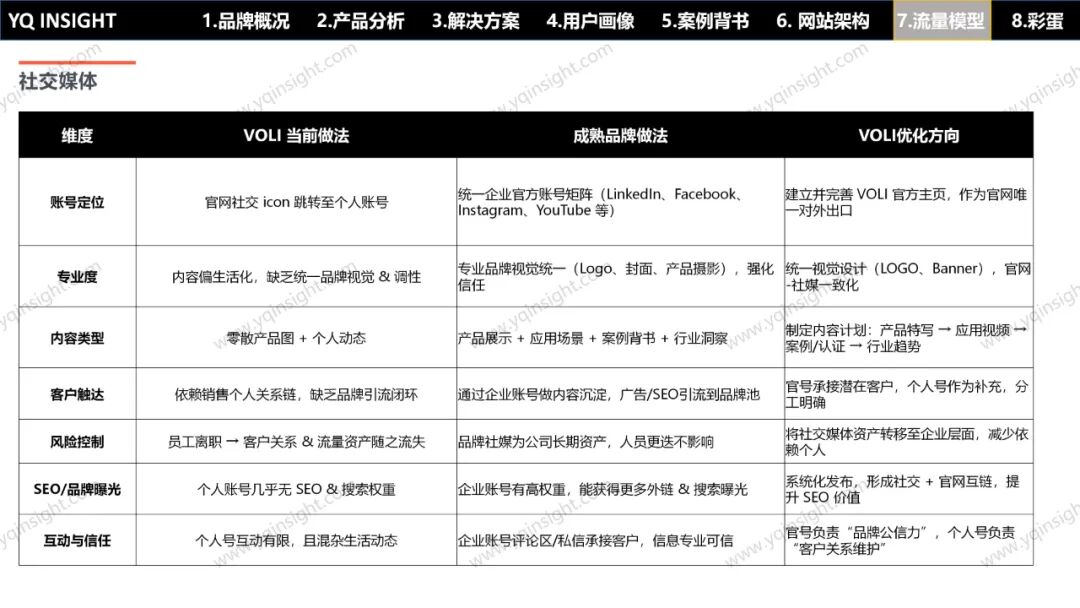 从 VOLI 的情况来看,它的社交媒体运营几乎等同于“缺席”,甚至存在将客户引导到个人账号的误用。这在工厂型企业中很常见,但长期来看风险极大。
