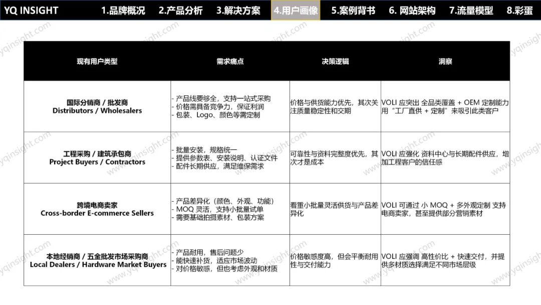 这四类用户的共性是:交易频繁但利润有限。他们在意供货速度、成本控制和灵活定制,但很难给 VOLI 带来溢价。换句话说,这些是典型的“工厂型外贸客户”。