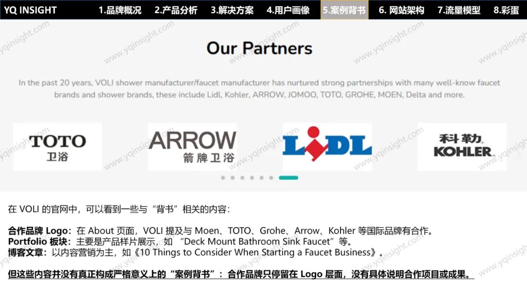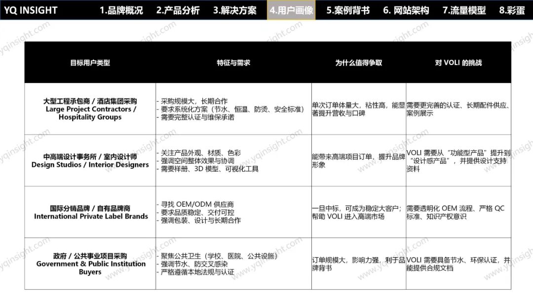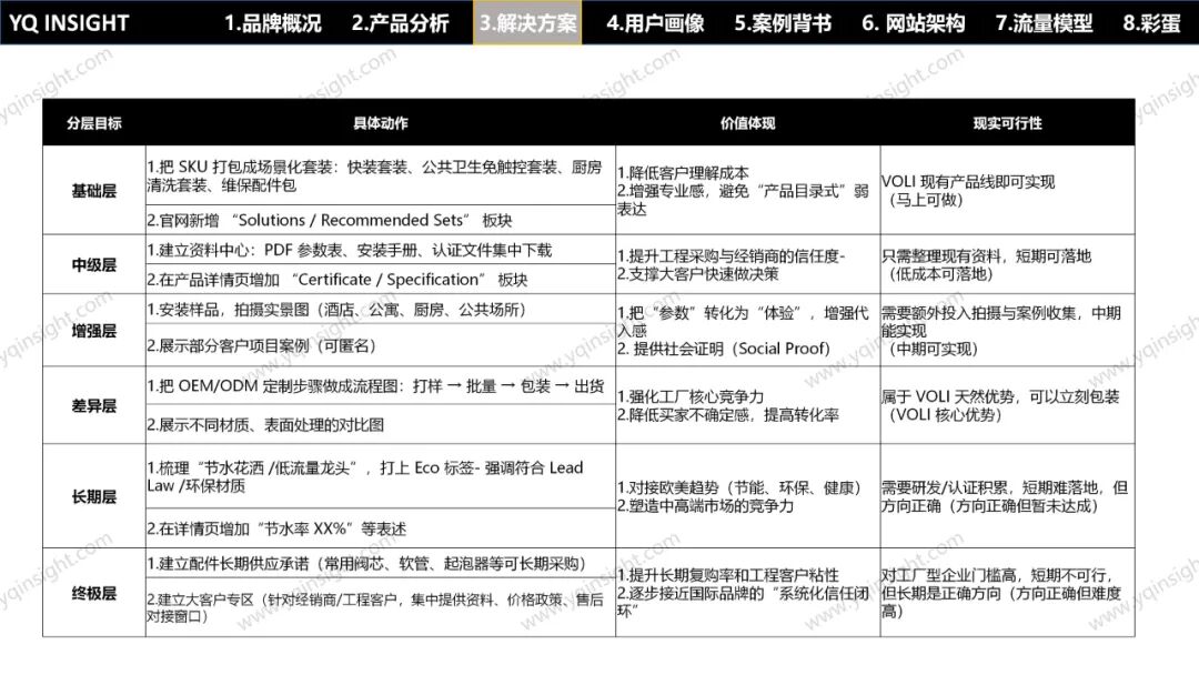 - 把参数变成体验:数据是冷的,体验是热的。VOLI的官网缺少安装实景、客户案例、应用照片,这让客户很难想象产品的使用场景。哪怕只是酒店浴室的一张照片、某个工程的logo背书,都能把“规格”转化为“体验感”。