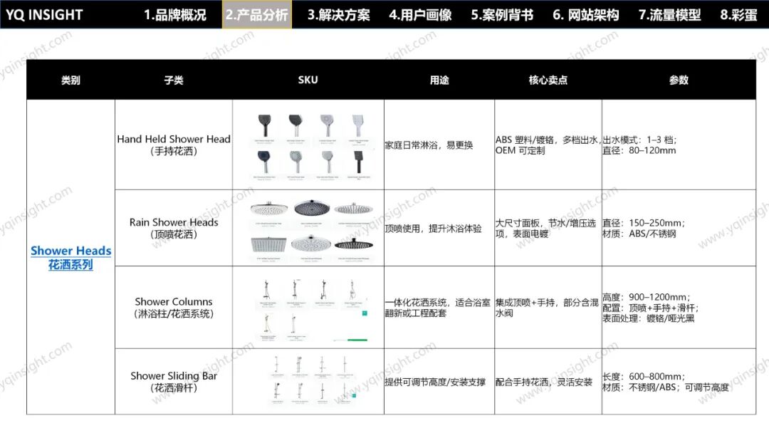 - 核心逻辑:材质(ABS/铜/不锈钢)、表面处理(电镀/拉丝/哑光黑)、OEM定制(Logo/包装/颜色)、功能体验(节水、多档出水、软管防缠绕)。