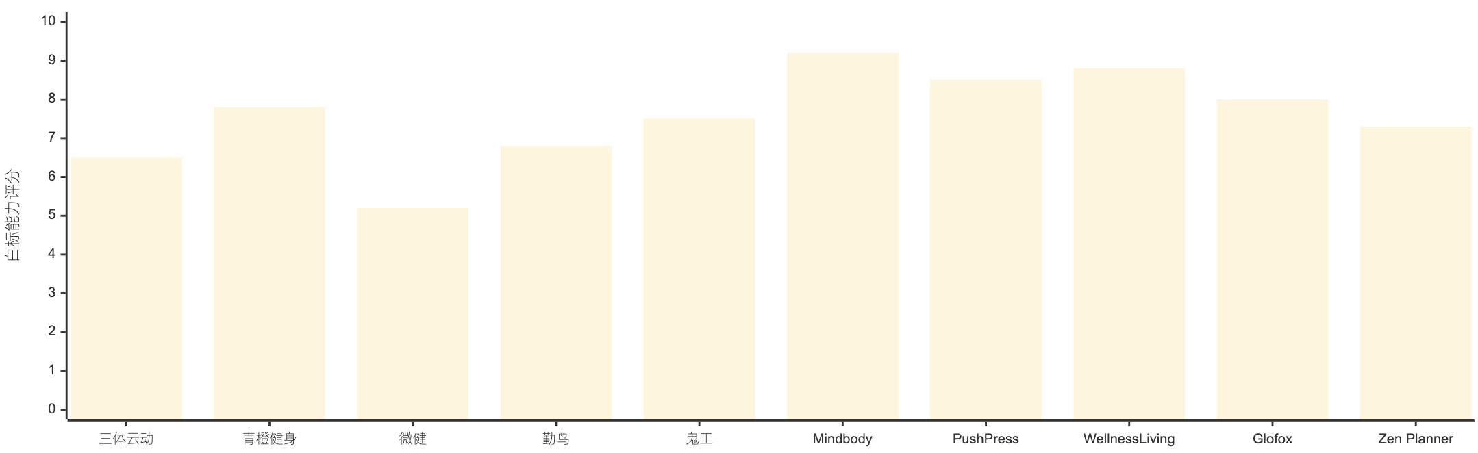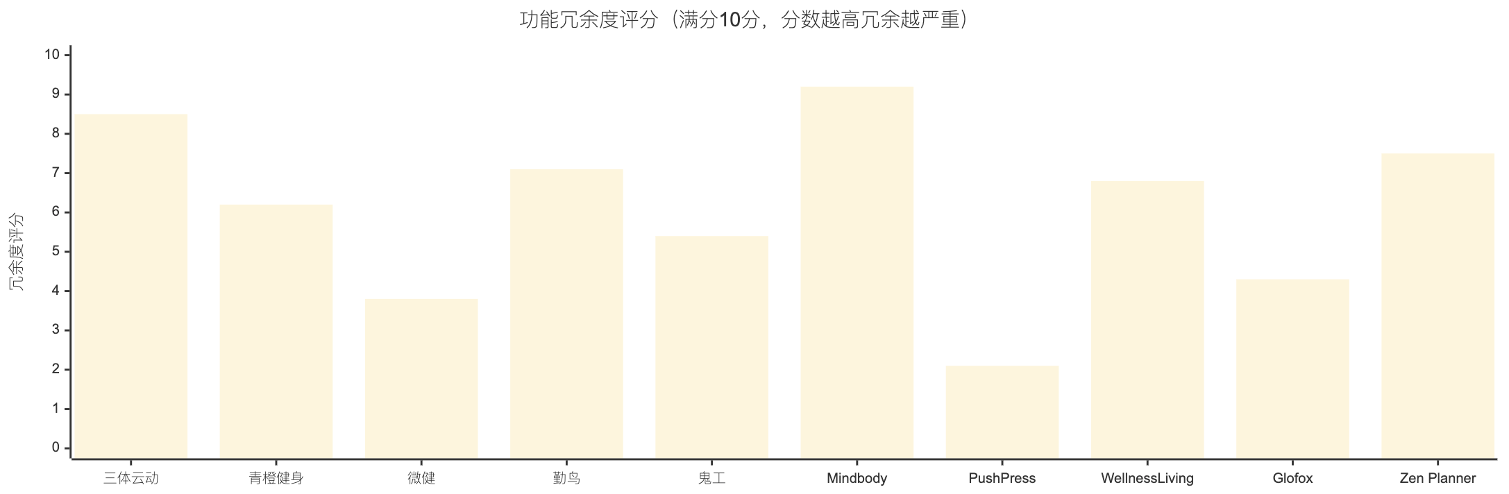 - Mindbody功能冗余度最高(9.2分),功能过于复杂导致学习成本高