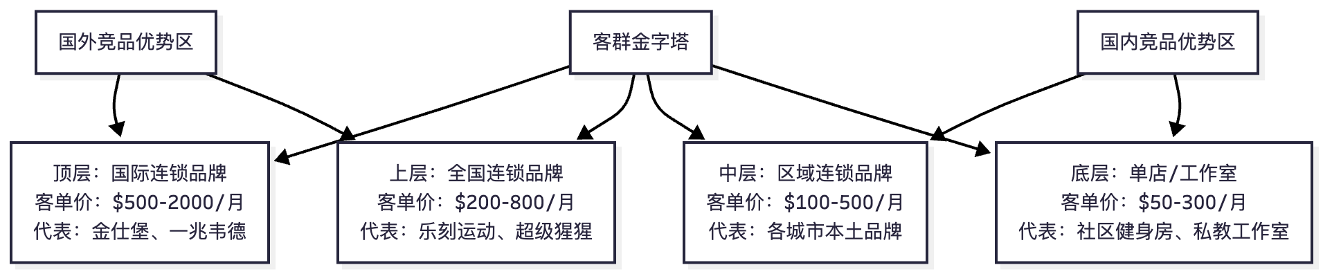 - Mindbody、Glofox占据金字塔顶端,服务国际品牌