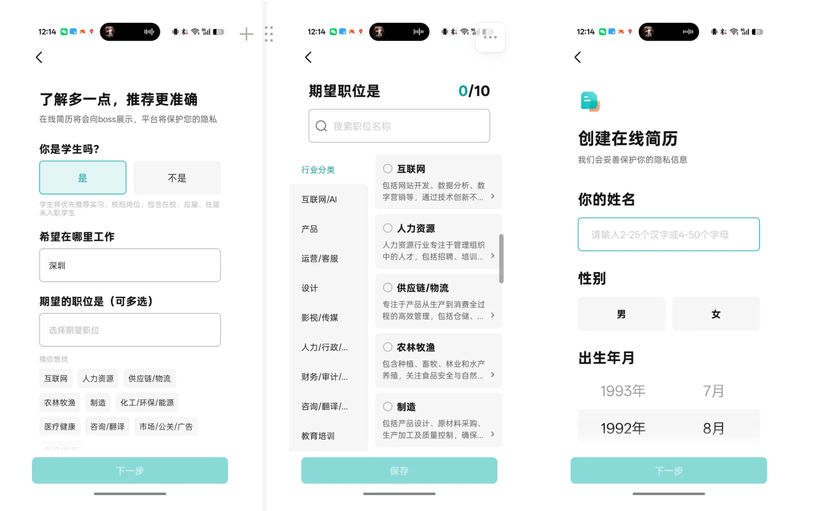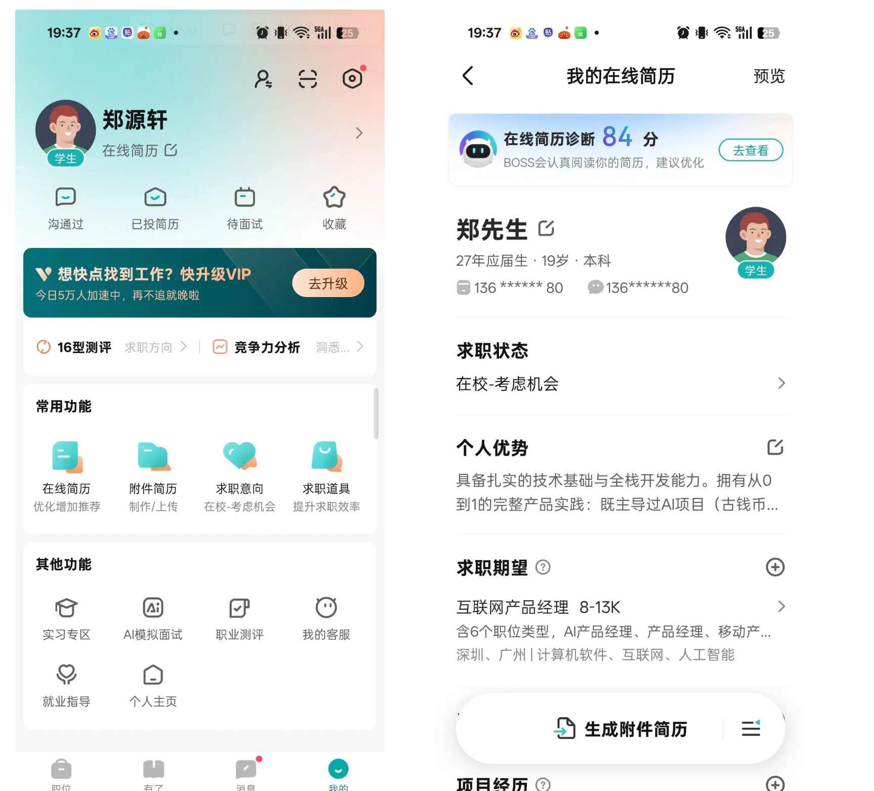 - 有在线简历和附件简历:在直聊中都可以让BOSS看到;