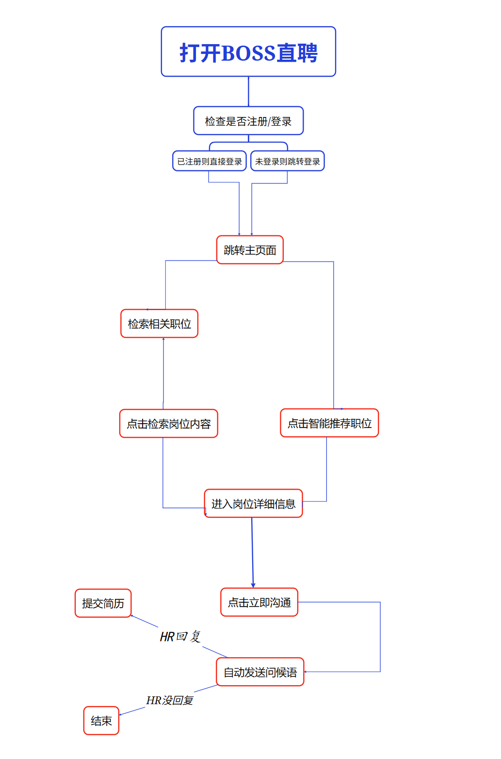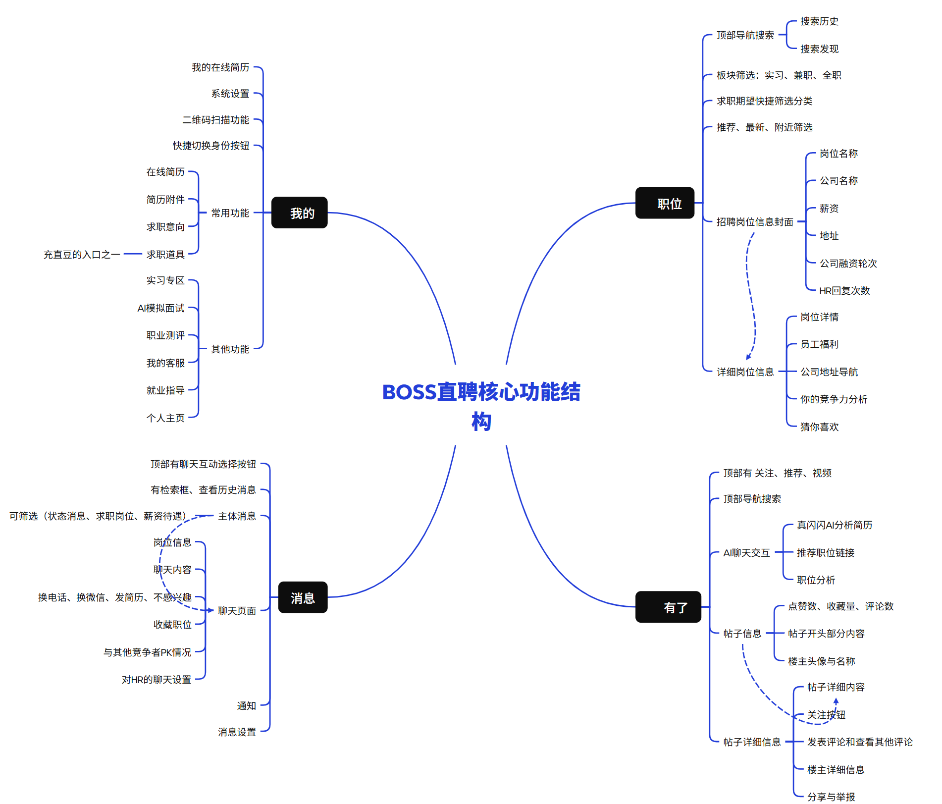 我通过我自己画的思维导图、流程图,来说明BOSS直聘核心功能结构图、简历投递的核心流程