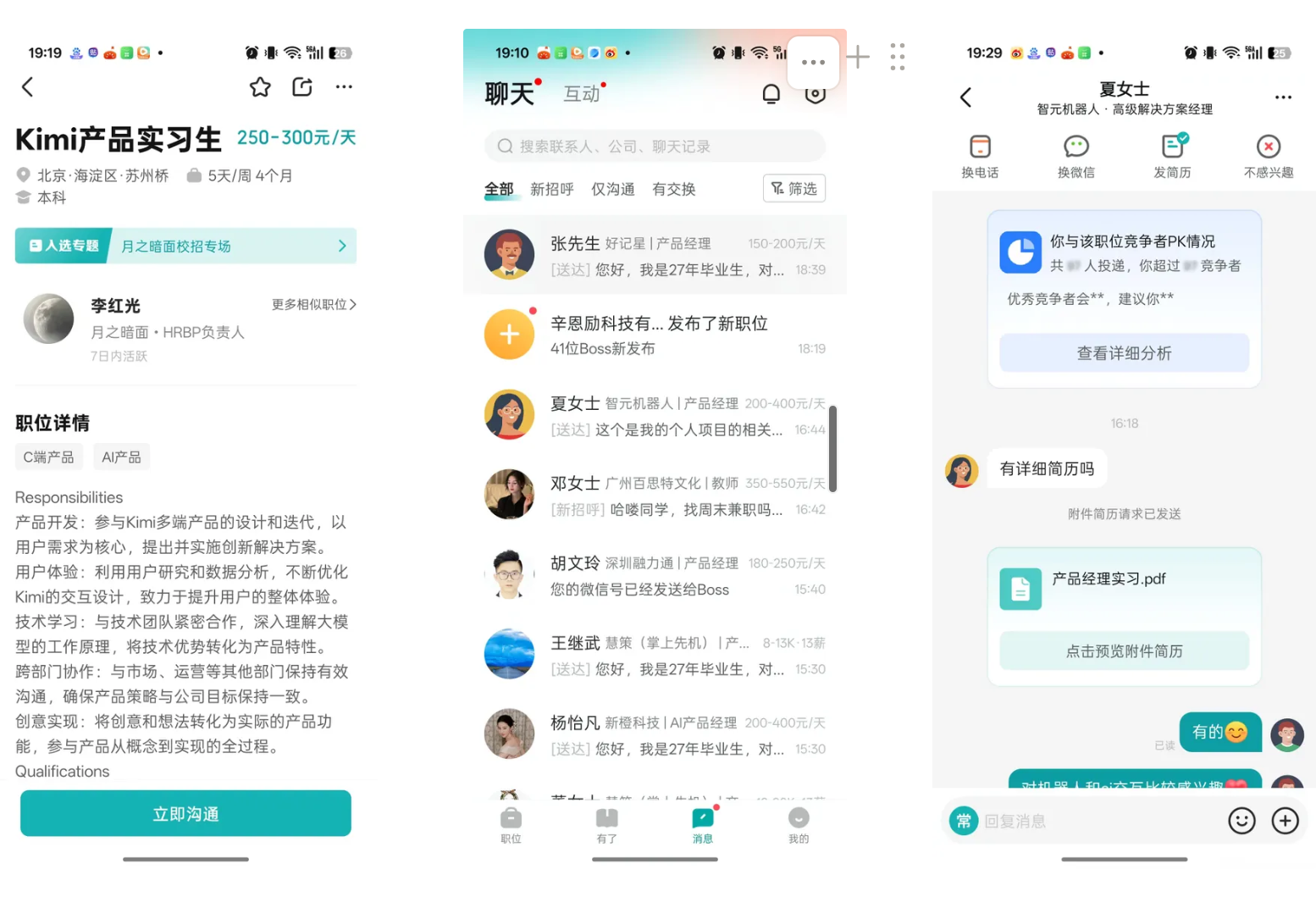 - 直聊界面:支持文字、图片、文件信息,顶部有快捷发送微信号、手机号、发送简历的按钮,再次通过简单的交互提高效率,增强可用性;