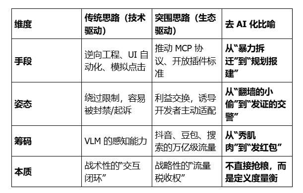 2)“如果说 App 是一座座紧闭大门的‘私人领地’,与其派特种兵翻墙(劫持 UI),不如直接由豆包牵头修一套‘高速公路标准’。