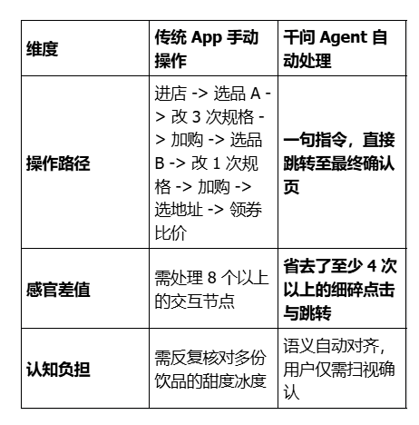 - 路径压缩: 传统 App 需要经历“搜索-比价-选店-选品-加购”约 6-8 次点击;Agent 模式下缩减为“输入-确认”2 步,操作步数节省约 60%。