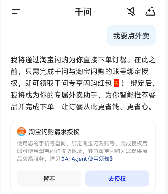 不同于以往需要去插件市场手动“安装”,千问对淘宝闪购/外卖能力的调用是意图驱动的。