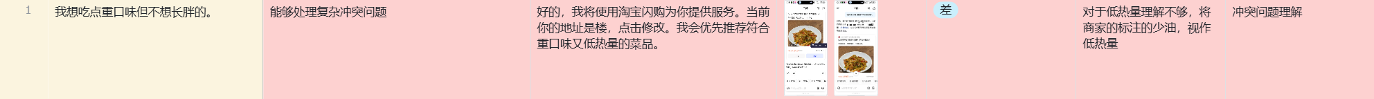 反馈结果: 推荐的菜品既无法满足用户对“重口味”的心理补偿,也未达成真正的“减脂”目标。