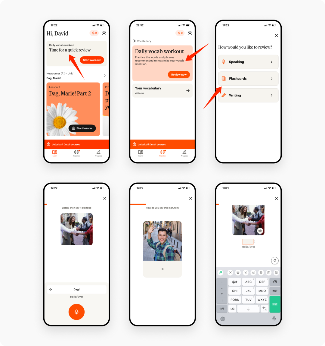Babbel 在首页和练习菜单栏都设置了「Daily vocab workout」模块,帮助用户在短时间内回顾近期学习内容。点击「Start workout」后,用户可自由选择三种复习模式:口语(Speaking)、卡片(Flashcards)、拼写(Writing)。这种复习模式是 Babbel 的特色之一——整个过程轻量而专注,不重复完整课程,而是精选近期错题与核心词汇,帮助用户高效巩固记忆。