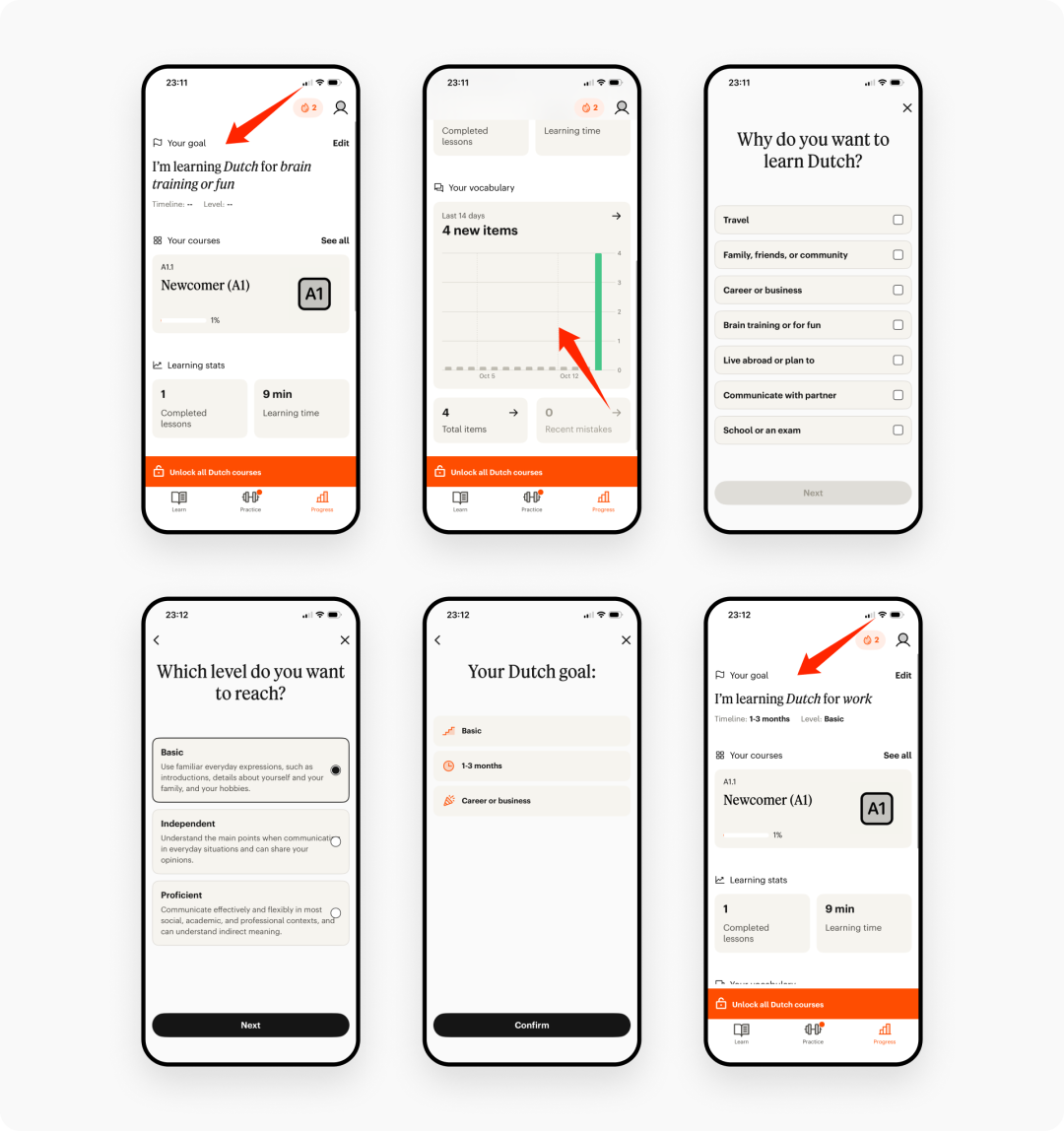 Progress 栏目是 Babbel 展示学习成果与强化目标感的核心界面。用户可在顶部随时调整学习动机(如旅行、工作、兴趣等),系统会据此生成一句醒目的个性化目标陈述,例如「I’m learning Dutch for work」。这种设计将抽象的学习目的转化为具体的语言表达,既增强激励感,也让用户时刻明确「为何而学」。