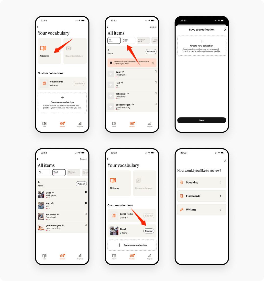 Babbel 的「Practice」栏目延续了其一贯的简洁与高效。这里汇总了用户在学习过程中积累的词汇,并以Weak/Medium/Strong三个等级分类,帮助学习者快速识别需要重点复习的词汇。用户可以将词汇加入自定义收藏夹(Custom collections),创建专属练习集。每个集合支持三种复习模式:Speaking(口语)、Flashcards(卡片)、Writing(拼写),让复习更具针对性与灵活性。