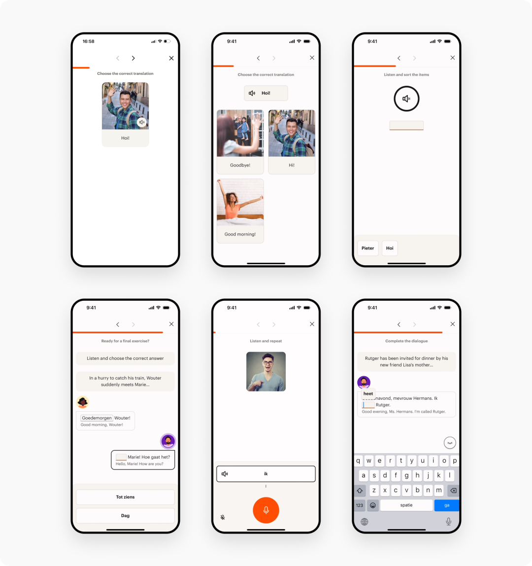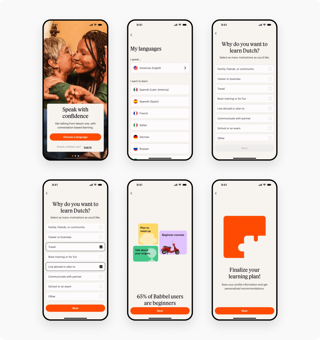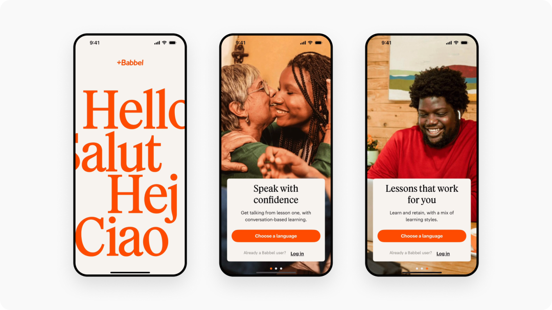Babbel 则刻意避开游戏化元素,选择米色背景、克制的橙色点缀、真实摄影配图,营造温和而专业的学习空间。它不试图讨好用户,而是建立「严肃但不严厉」的权威感。整个产品传递的信号是:这里是成人世界的语言学习场所,我们尊重你的时间与目标,提供高效的专业服务,而非娱乐消遣。