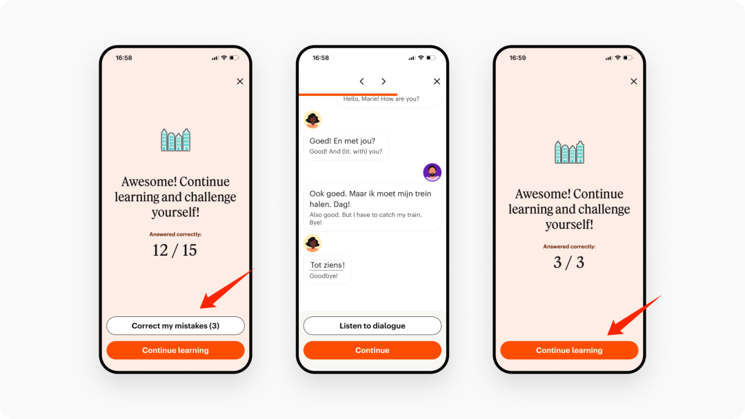 Babbel 的错题复习设计采用了与多邻国完全不同的策略。多邻国在学习环节中即时整合错题复盘,用户必须重新完成错题后才能结束练习;而 Babbel 则将复习阶段独立出来——在课程结束页明确显示正确率与错题数量(如「Answered correctly:12/15」),并通过「Correct my mistakes」按钮让用户自主选择是否复习错题。
